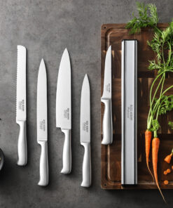- Magnetic metal wall bar for safe, space-saving storage – ideal for domestic kitchens and professional prep areas.