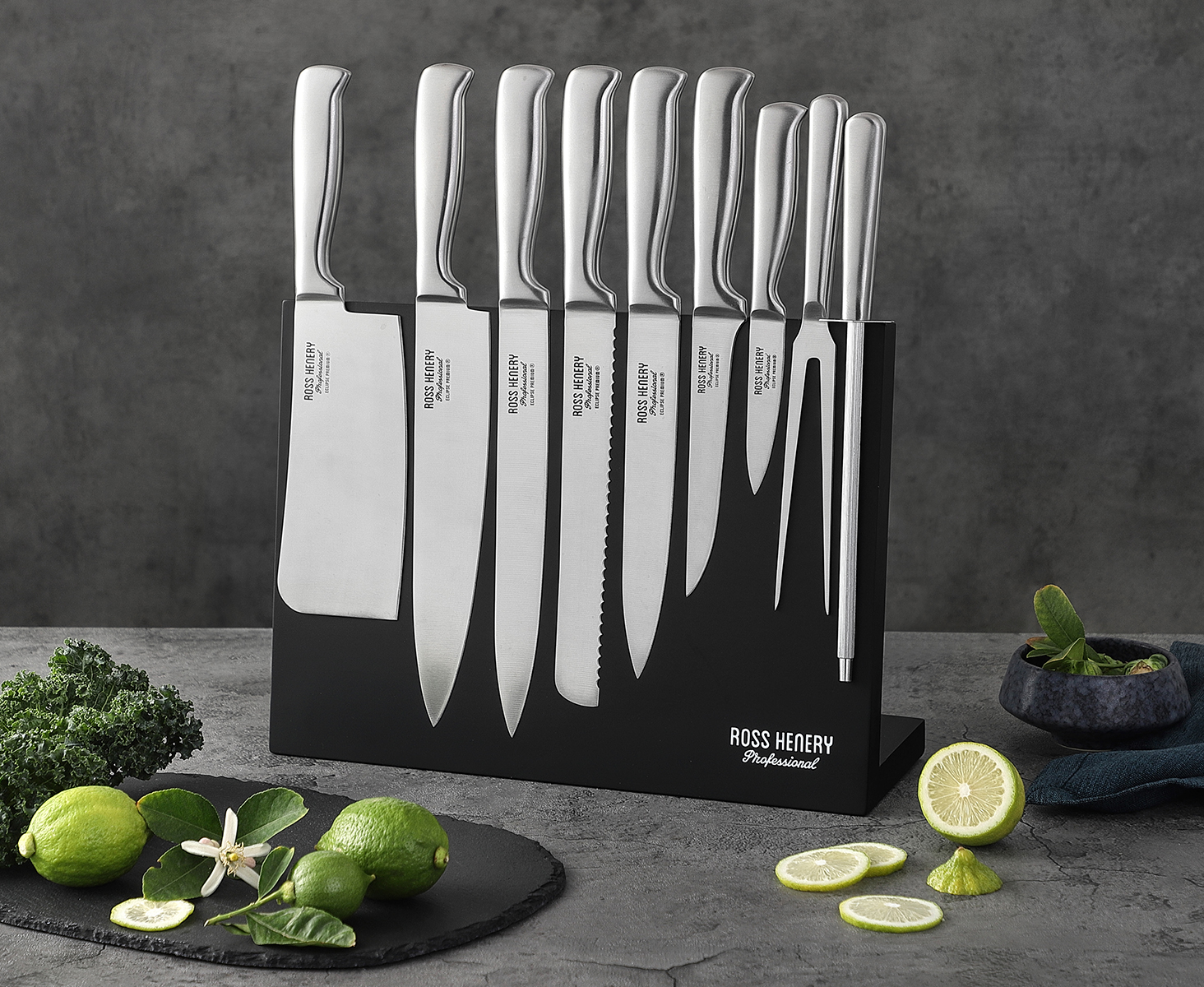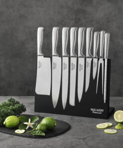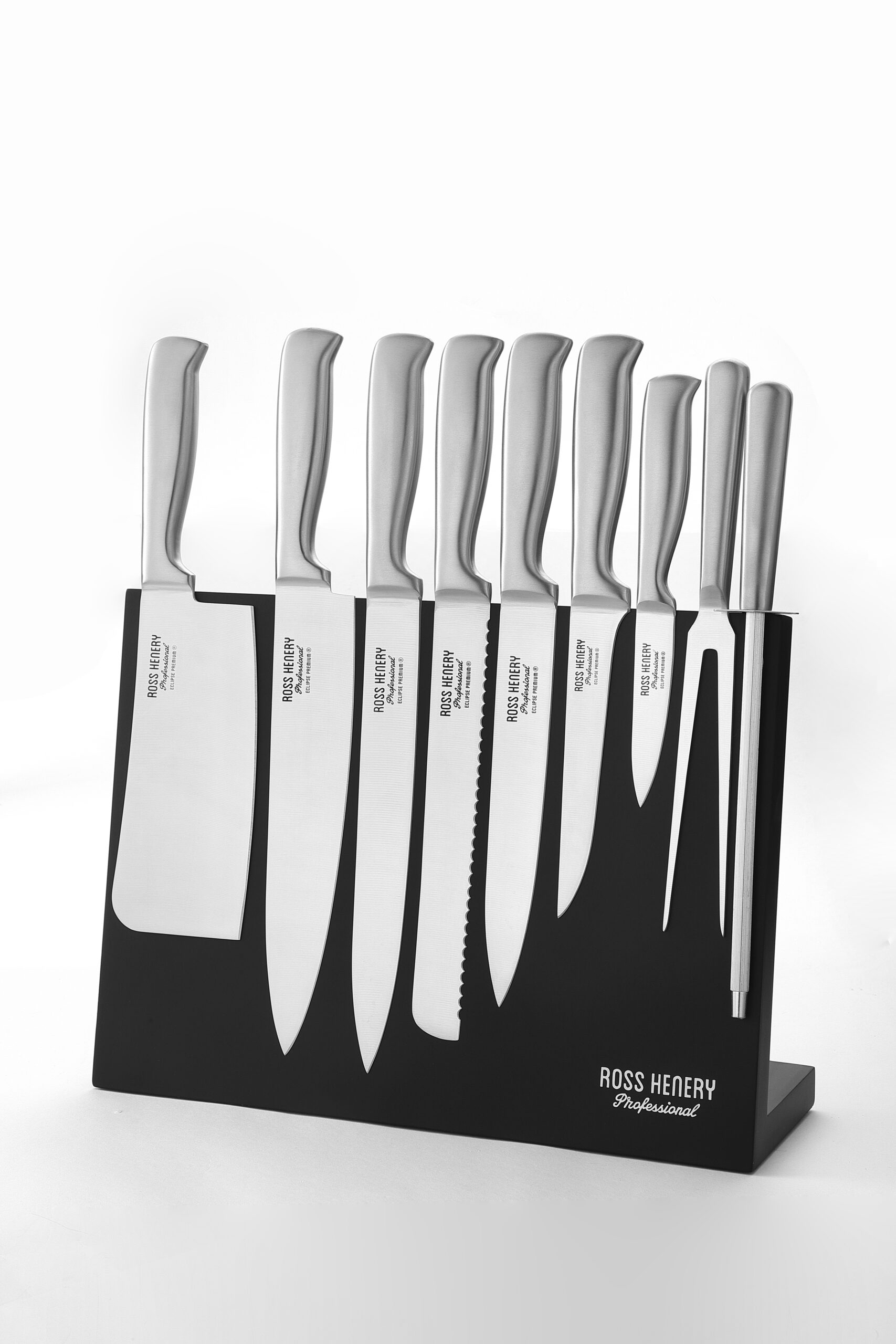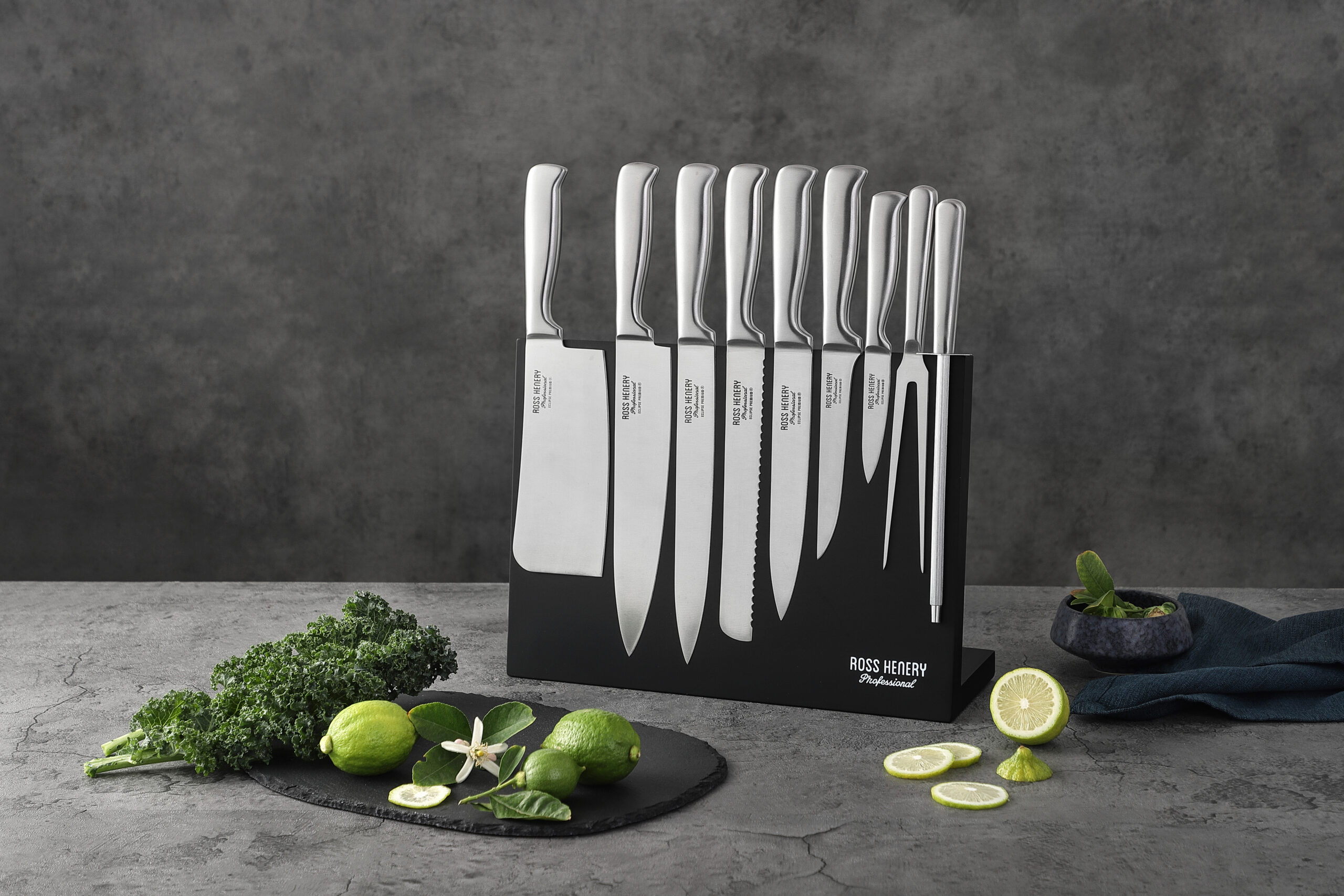 This Premium Ross Henery Professional Eclipse 9-piece knife set is a modern, space-saving knife set presented on a smart black magnetic board. Designed for both style and practicality, the strong magnetic surface securely displays each knife for quick, easy access. Perfect for both home kitchens and busy professional work environments, offering a clean, organised, and visually striking way to store your knives.