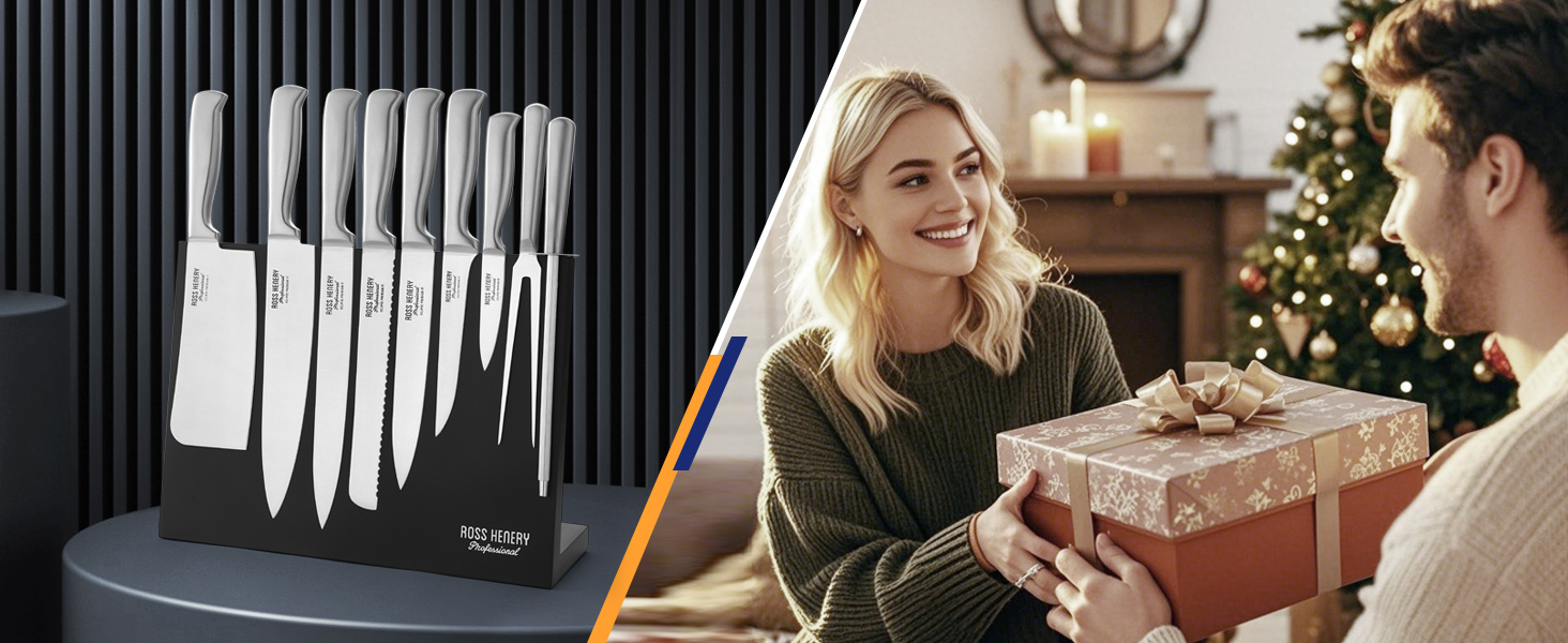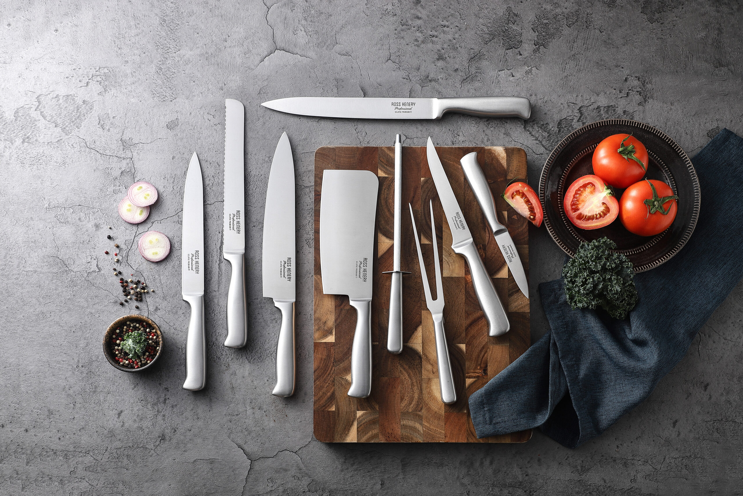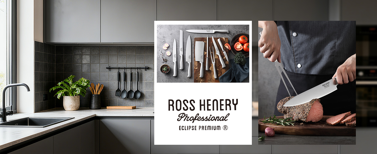 This Premium Ross Henery Professional Eclipse 9-piece knife set is a modern, space-saving knife set presented on a smart black magnetic board. Designed for both style and practicality, the strong magnetic surface securely displays each knife for quick, easy access. Perfect for both home kitchens and busy professional work environments, offering a clean, organised, and visually striking way to store your knives.