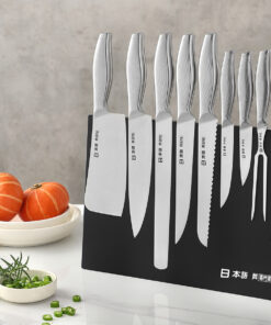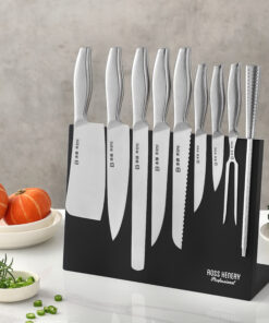This Premium Ross Henery Professional Japanese Style 9-piece knife set is a modern, space-saving knife set presented on a smart black magnetic board. Designed for both style and practicality, the strong magnetic surface securely displays each knife for quick, easy access. Perfect for both home kitchens and busy professional work environments, offering a clean, organised, and visually striking way to store your knives.