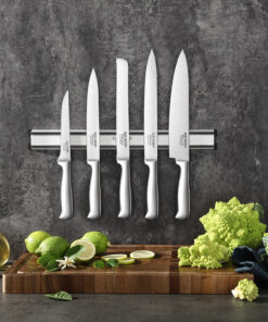 - Magnetic metal wall bar for safe, space-saving storage – ideal for domestic kitchens and professional prep areas.