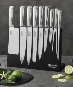 This Premium Ross Henery Professional Eclipse 9-piece knife set is a modern, space-saving knife set presented on a smart black magnetic board. Designed for both style and practicality, the strong magnetic surface securely displays each knife for quick, easy access. Perfect for both home kitchens and busy professional work environments, offering a clean, organised, and visually striking way to store your knives.